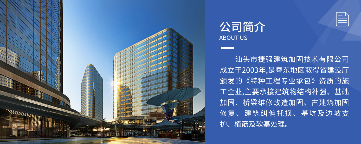 汕頭市捷強建筑加固技術(shù)有限公司 正式上線! 汕頭市捷強建筑加固技術(shù)有限公司是粵東地區(qū)取得省建設(shè)廳頒發(fā)的《特種工程專業(yè)承包》資質(zhì)的施工企業(yè)。 我們堅信,捷強能以其精湛的施工技術(shù),特優(yōu)的品質(zhì)價格贏得您的信賴與合作!